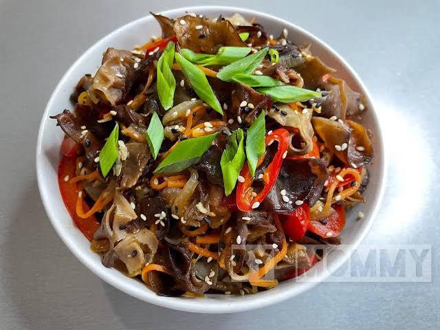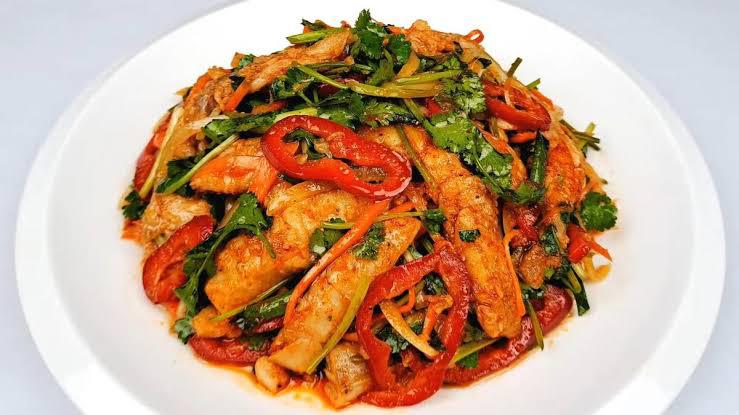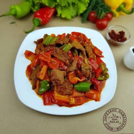 Горячий салат: курица рубленая, перец красный и зеленый, чеснок, лук, острые приправы