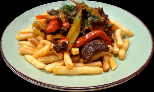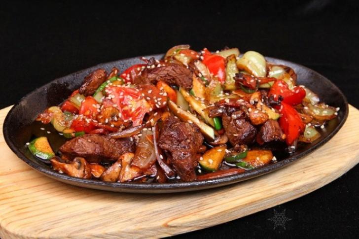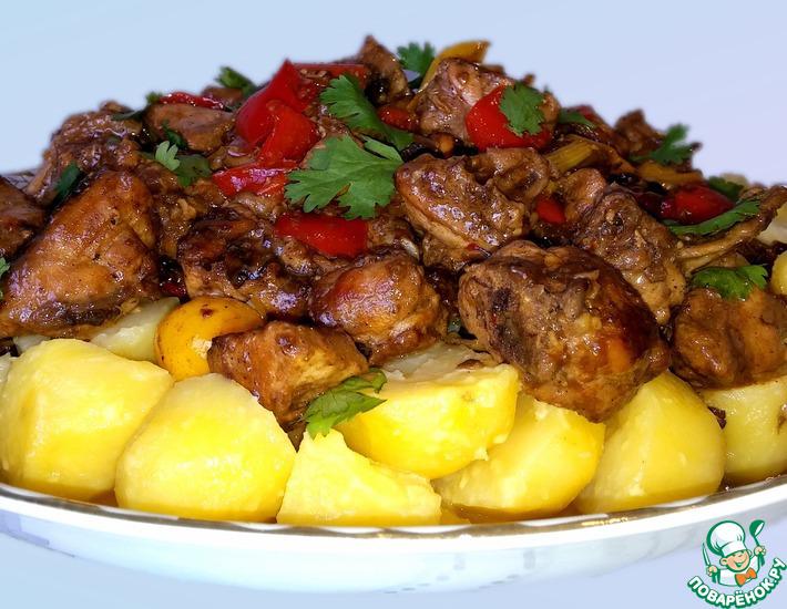 Бараньи ребра с овощами (перец красный зеленый, пекинская капуста, картофельные дольки, помидор)